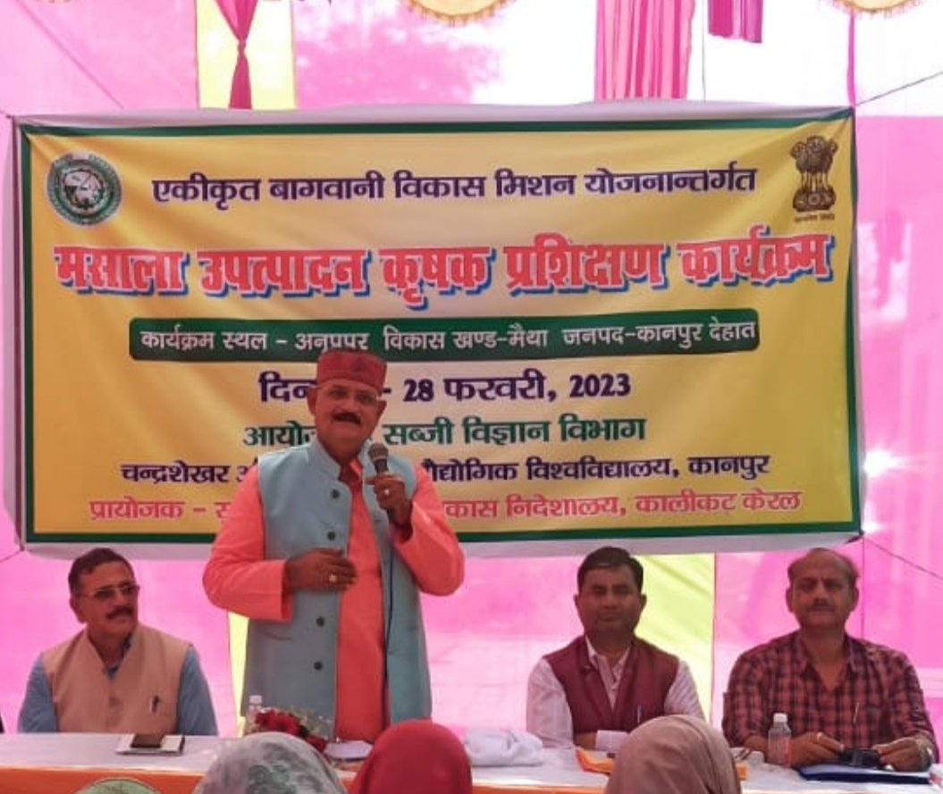 शिवली,01 मार्च 2023। मैथा तहसील के अनूपपुर गांव में मंगलवार को चंद्रशेखर आजाद कृषि एवं प्रौद्योगिकी विश्वविद्यालय कानपुर के सब्जी अनुभाग द्वारा एक दिवसीय मसाला फसलों के उत्पादन पर कृषक प्रशिक्षण का आयोजन किया गया। इस कार्यक्रम में विभागाध्यक्ष डॉ आर बी सिंह ने बताया कि उत्तर प्रदेश में लगातार मसाला फसलों के उत्पादन और क्षेत्रफल में वृद्धि हो रही है। उन्होंने किसानों को प्रजातियों एवं कृषि तकनीकों के बारे में विस्तार से जानकारी दी। कार्यक्रम के मुख्य अतिथि विश्व विद्यालय के प्रबंध मंडल के सदस्य श्याम मोहन दुबे ने किसानों से अपील की कि वे वैज्ञानिकों द्वारा बताई गई कृषि तकनीकों को अवश्य अपनाएं। जिससे वे स्वावलबी हो कर आत्म निर्भर बने। कृषि विज्ञान केंद्र दिलीपनगर के प्रभारी डॉ एके सिंह ने केंद्र की उपलब्धियों की जानकारी दी। कार्यक्रम की अध्यक्षता प्रगतिशील कृषक संजय तिवारी ने की। कार्यक्रम का संचालन डॉक्टर खलील खान ने किया।